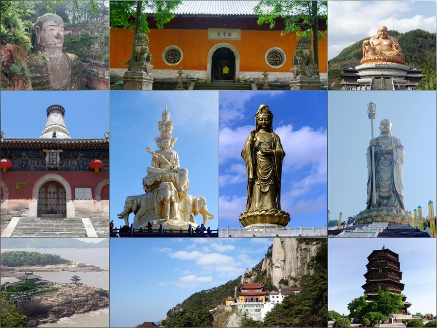 安徽九華山 、山西五台山、浙江普陀山、四川峨嵋山並稱為中國佛教四大聖地,前往四大聖地體驗佛教之美。四大佛教名山有「金五台、銀普陀、銅峨嵋、鐵九華」之稱。大乘佛教佛經稱四大菩薩在遠古已成佛,如觀世音菩薩過去佛號正法明如來,四大菩薩為度眾生重入人世。四大聖地分別為:普陀山-觀音菩薩道場、五台山-文殊菩薩道場、峨嵋山-普賢菩薩道場、九華山-地藏菩薩道場,此次行程特別包含位於浙江寧波市奉化有第五大名山之稱雪竇寺,供奉彌勒佛,香火鼎盛。